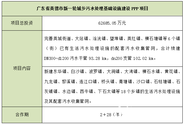 廣東省英德市新一輪城鄉(xiāng)污水處理基礎(chǔ)設(shè)施建設(shè)PPP項(xiàng)目