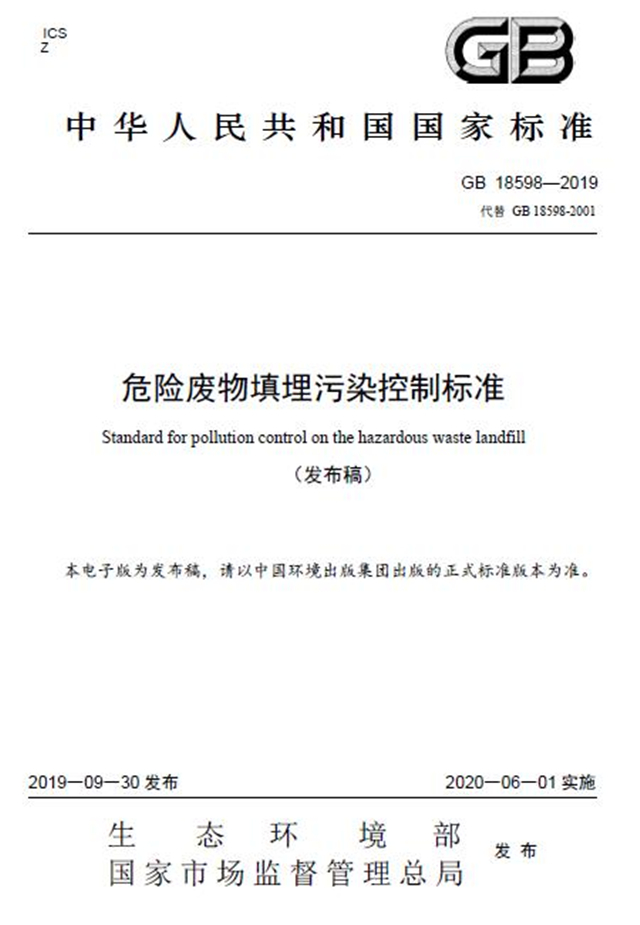 該標(biāo)準(zhǔn)自2020年6月1日起實(shí)施,自實(shí)施之日起,《危險(xiǎn)廢物填埋污染控制標(biāo)準(zhǔn)》(GB18598-2001)同時(shí)廢止。