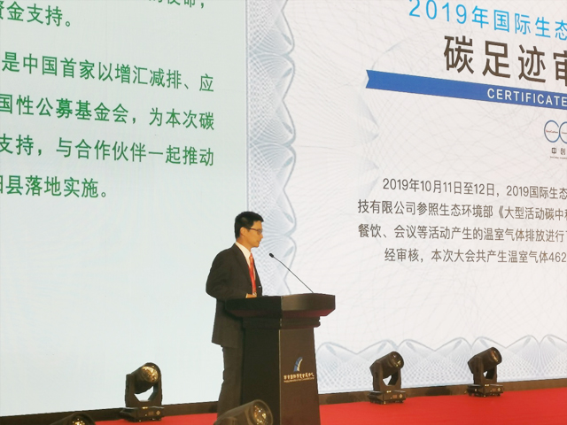 在生態(tài)環(huán)境部莊國泰副部長、江蘇省人民政府郭元強副省長等領(lǐng)導(dǎo)及嘉賓的見證下,北京中創(chuàng)碳投科技有限公司副總經(jīng)理錢國強先生宣讀了大會溫室氣體排放量并出具審核證書。江蘇省生態(tài)環(huán)境廳應(yīng)對氣候與國際合作處王華處長為中創(chuàng)碳投頒發(fā)了碳中和紀(jì)念證書。