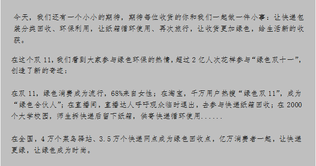 當(dāng)然,言歸正傳,環(huán)保對電商平臺和物流公司來說有多重要,就看馬云說的“未來的快遞業(yè),‘快’保證不輸,‘綠’才能贏”,為環(huán)保打Call的姿態(tài)可是正正的。