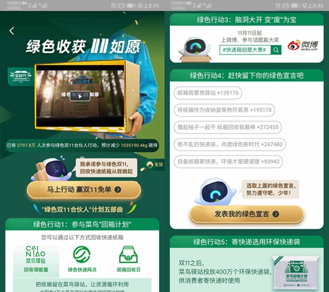 2019年雙十一,“回箱計(jì)劃”更是入駐購物平臺,發(fā)起“綠色雙11合伙人”行動,以“贏雙11免單”的噱頭吸引更多人參與菜鳥“回箱計(jì)劃”。而為了更高的關(guān)注度,天貓雙十一發(fā)言人微博在11月12日發(fā)長圖“致每位收獲的你”。