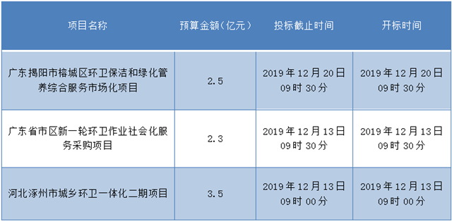 環(huán)衛(wèi)大標(biāo)出沒,3個過億項目已經(jīng)啟動招標(biāo),其中2個在廣東,1個在河北,心動的你不要錯過招標(biāo)時間哦。