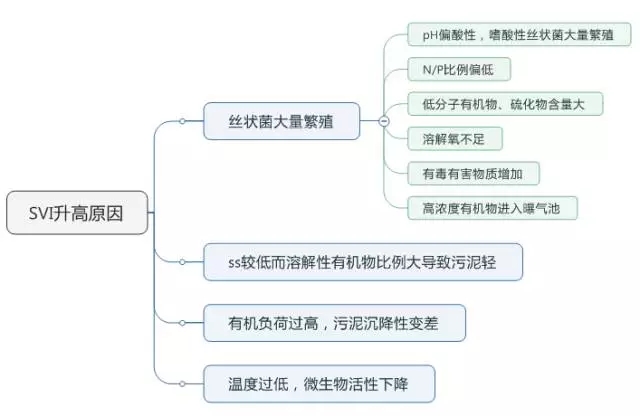 SVI值與污泥負(fù)荷有關(guān),污泥負(fù)荷過高或過低,活性污泥的代謝性能都會(huì)變差,SVI值也會(huì)變很高,存在出現(xiàn)污泥膨脹的可能。