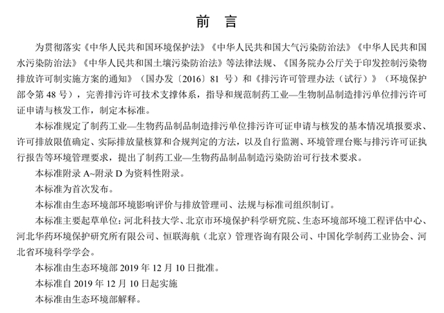 為貫徹落實(shí)《中華人民共和國(guó)環(huán)境保護(hù)法》《中華人民共和國(guó)大氣污染防治法》《中華人民共和國(guó)水污染防治法》《中華人民共和國(guó)土壤污染防治法》等法律法規(guī)、《國(guó)務(wù)院辦公廳關(guān)于印發(fā)控制污染物排放許可制實(shí)施方案的通知》(國(guó)辦發(fā)〔2016〕81號(hào))和《排污許可管理辦法(試行)》(環(huán)境保護(hù)部令第48號(hào)),完善排污許可技術(shù)支撐體系,指導(dǎo)和規(guī)范制藥工業(yè)—生物制品制造排污單位排污許可證申請(qǐng)與核發(fā)工作,制定本標(biāo)準(zhǔn)。