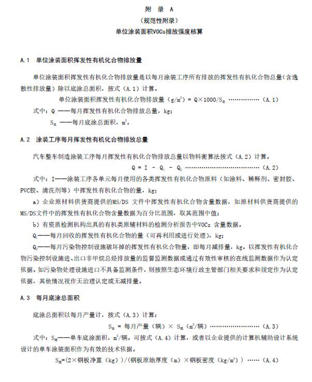 單位涂裝面積VOCs排放強度限值應符合表4規(guī)定,計算方法按附錄A執(zhí)行,國家發(fā)布行業(yè)污染源源強核算標準后,依據(jù)國家源強核算標準進行核算。