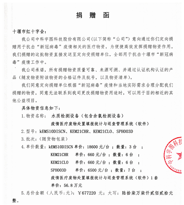 面對嚴(yán)峻的疫情形勢,中科宇圖積極響應(yīng)國家號召,本著對社會負(fù)責(zé)的態(tài)度,積極投身疫情防控阻擊戰(zhàn)。2月11日,中科宇圖通過湖北省十堰市紅十字會,向疫情重災(zāi)區(qū)十堰定向捐贈價值約70萬元的軟硬件防疫醫(yī)療物資,受贈單位十堰市生態(tài)環(huán)境局將用于抗擊十堰市“新冠肺炎”疫情工作當(dāng)中。