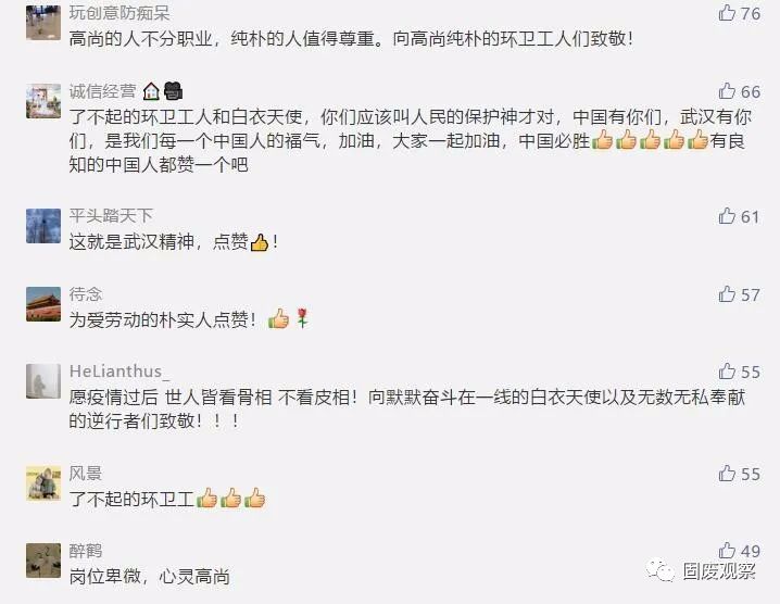 近日,荊楚網(wǎng)一篇《武漢隔離的環(huán)衛(wèi)工退房后,酒店經(jīng)理邊查房邊抹淚》的微信,讓無數(shù)讀者落淚,并紛紛點(diǎn)贊:“她們是最美最可敬的人!”“平凡的崗位造就了不平凡的人”“他們不僅打掃看得見的垃圾,還能清潔我們心靈里的灰塵”“我含著眼淚向這群擁有最美心靈的姐妹們致敬!”“平凡的人們給我最多感動(dòng)!”