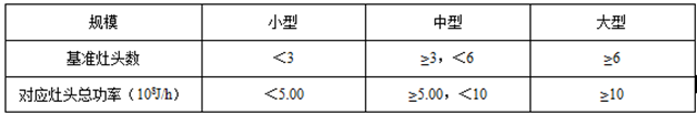 4.1.1餐飲服務單位規(guī)模按照基準灶頭數(shù)劃分為大型和中小型?;鶞试铑^數(shù)按灶的總發(fā)熱功率折算,每個基準灶頭對應的發(fā)熱功率為1.67×108J/h。餐飲服務單位的規(guī)模劃分參數(shù)見表1。