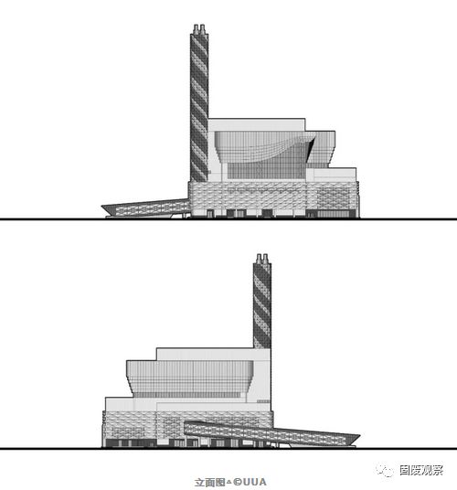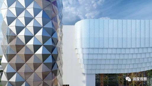 煙囪外立面采用了與裙房類似的“菱形”元素,并通過“穿孔板”和“鋁單板”兩種材質有規(guī)律的排布,形成螺旋上升的態(tài)勢。