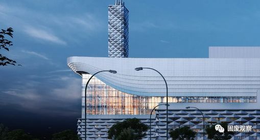 幕墻造型自下而上層層出挑,并在每層的下方加入燈帶。層疊反射的幕墻板材與燈光配合,共同營造出了一種迷幻的未來感。