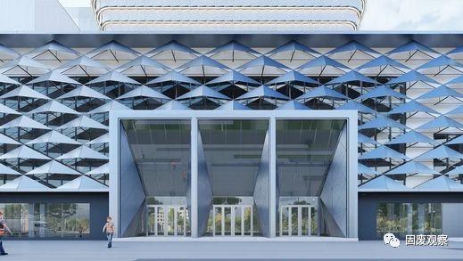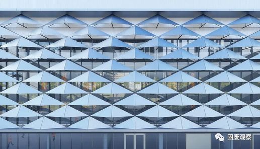 整個建筑形體如同一艘激流勇進的大舸,在“船體”部分的幕墻采用了白色彩釉玻璃+點狀鏡面鍍層的材料。點狀鏡面對天空的反射能使建筑在一定程度上融入到背景之中。