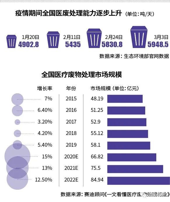截至3月3日,湖北省醫(yī)廢處置能力從疫情前的180噸/天提至663.7噸/天;全國能力從疫情前的4902.8噸/天提至5948.5噸/天。