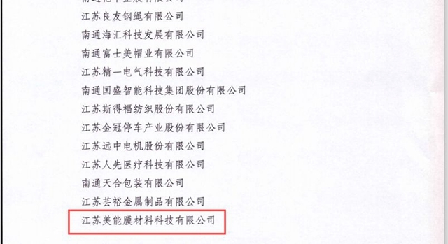 《名單》顯示,中信環(huán)境技術(shù)旗下美能膜重要生產(chǎn)基地——江蘇美能膜材料科技有限公司榮登榜單。