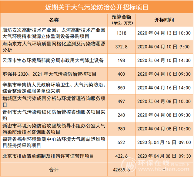 從中國政府采購網(wǎng)得知,近期關于大氣污染防治招標的項目有10個,均為2020年4月份開標,總金額達42635.6萬元,包括除塵設備、在線監(jiān)測系統(tǒng)、污染源探究等方面,具體如下: