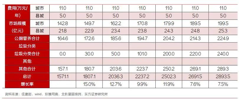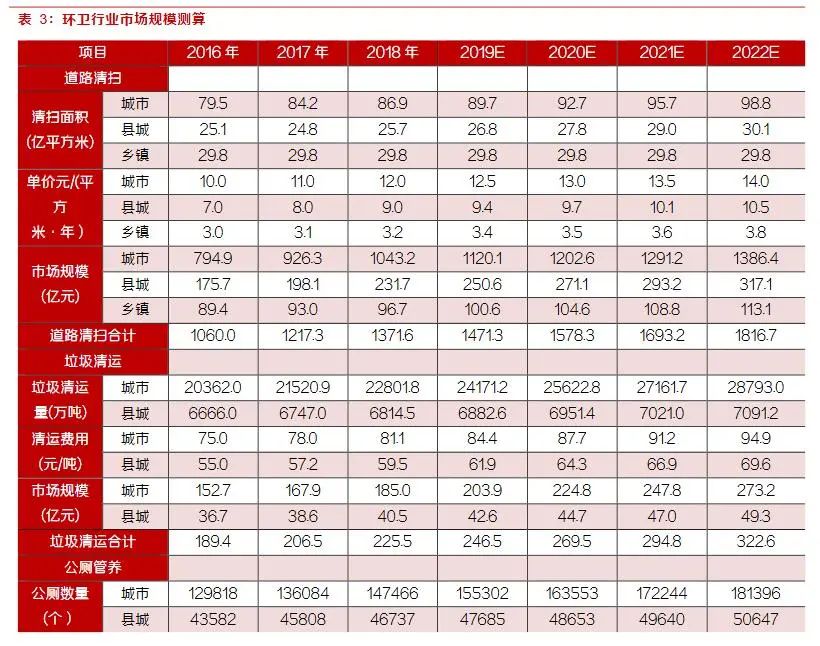 垃圾清運(yùn)層面,根據(jù)住建部統(tǒng)計(jì),2018年城市垃圾清運(yùn)量為2.28億噸,按目前市場情況,假設(shè)垃圾轉(zhuǎn)運(yùn)費(fèi)用城市為80元/噸,縣城為60元/噸,假設(shè)增長率與道路清掃相同均為4%,目前總規(guī)模在240億元左右。公廁管養(yǎng)方面,假設(shè)城市與縣城公廁數(shù)量的增長維持過去三年的平均增長率,管養(yǎng)費(fèi)用城市為11萬元/年,縣城為5萬元/年,則公廁管養(yǎng)費(fèi)用合計(jì)190億元左右。