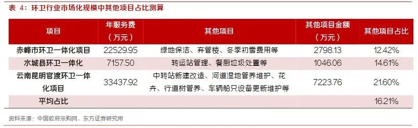 我們分別選取北京環(huán)境中標(biāo)的赤峰市環(huán)衛(wèi)一體化項(xiàng)目、龍馬環(huán)衛(wèi)中標(biāo)的水城縣環(huán)衛(wèi)一體化項(xiàng)目以及僑銀環(huán)保中標(biāo)的云南昆明官渡環(huán)衛(wèi)一體化項(xiàng)目三個具有代表性的環(huán)衛(wèi)一體化項(xiàng)目,測算其中除前述環(huán)衛(wèi)項(xiàng)目外其他項(xiàng)目所占比例。根據(jù)各項(xiàng)目合同中列示的作業(yè)項(xiàng)目工作量及單價(jià)計(jì)算可得前述項(xiàng)目金額,總服務(wù)費(fèi)減去前述項(xiàng)目服務(wù)費(fèi)得到其他項(xiàng)目金額??紤]云南昆明官渡環(huán)衛(wèi)一體化項(xiàng)目總金額達(dá)67億元,體量較大所以包含服務(wù)范圍相對更廣,故假設(shè)市場化合同中其他項(xiàng)目所占比例略低于平均值即15%左右。