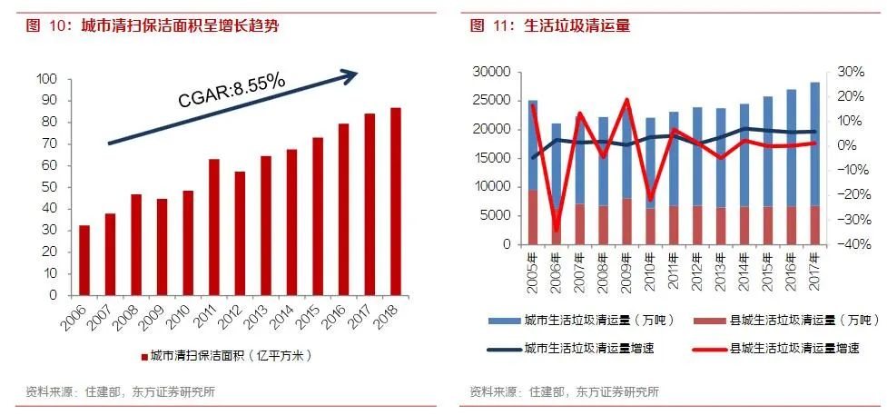 環(huán)衛(wèi)行業(yè)的收入來自于地方政府的環(huán)境衛(wèi)生建設(shè)的財(cái)政支出,2018年城鄉(xiāng)環(huán)境衛(wèi)生建設(shè)的財(cái)政支出達(dá)到2500億元,且過去三年保持16.7%左右的復(fù)合增速。城鎮(zhèn)化進(jìn)程的深入,城市邊界的的延伸,城市垃圾清運(yùn)和道路清掃的工作量會持續(xù)增長,環(huán)保要求的提高則推動了處理單價(jià)上漲,行業(yè)正在經(jīng)歷量和價(jià)值雙重提升的局面。
