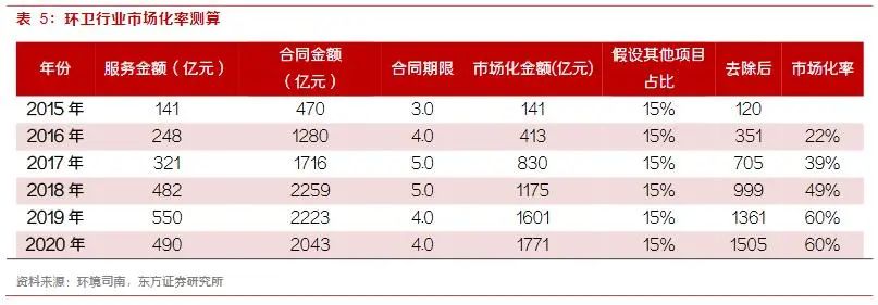 (2)環(huán)衛(wèi)市場化率約為60%,仍有較大的發(fā)展空間根據(jù)當(dāng)年新簽首年服務(wù)費(fèi)用與之前未到期合同年均服務(wù)金額相加得到當(dāng)年的市場化規(guī)模,市場化初期以政府購買為主,合同年限一般在3年左右,2017年開始PPP模式大規(guī)模發(fā)展,但政府購買仍為主要模式,因此假設(shè)2017年之前合同平均期限逐年增加至5年。用所得市場化金額與前述市場總規(guī)模相比可得到當(dāng)年環(huán)衛(wèi)市場化的比例。由于前述市場規(guī)模測算僅包含環(huán)衛(wèi)服務(wù)中道路清掃、垃圾清運(yùn)、公廁管養(yǎng)、垃圾分類等項(xiàng)目,而當(dāng)前市場化項(xiàng)目中通常打包一定比例的其他項(xiàng)目,如:河道濕地管養(yǎng)維護(hù)、新建或改造公廁、中轉(zhuǎn)站改造建設(shè)與運(yùn)營等,因此對于市場化測算,需要在現(xiàn)有合同金額數(shù)據(jù)上進(jìn)行一定程度的修正。即市場化金額除去其中包含的其他項(xiàng)目金額。