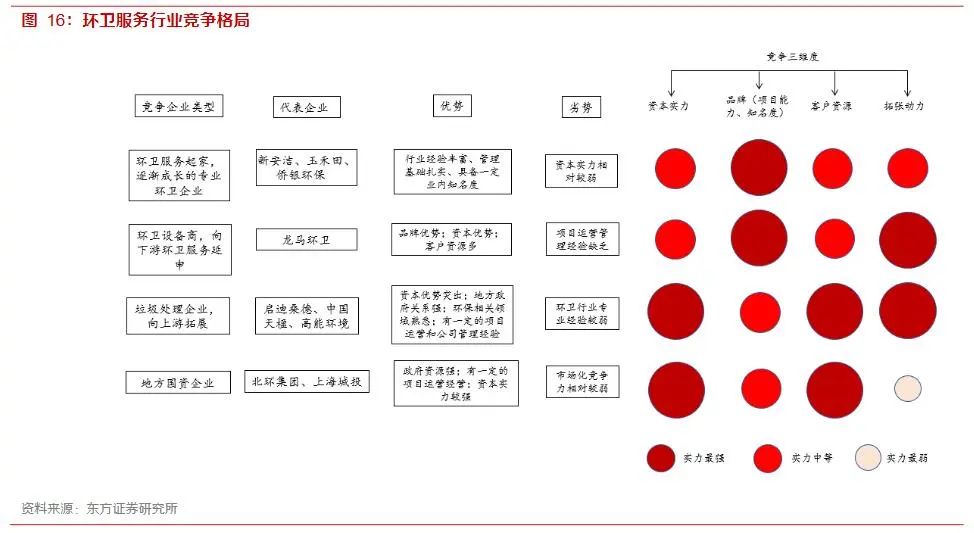 3)垃圾處理公司,向上游拓展,典型如啟迪桑德、中國天楹,政府關(guān)系、大項(xiàng)目管理能力、資本實(shí)力、異地?cái)U(kuò)張能力層面均非常強(qiáng),在品牌影響力和環(huán)衛(wèi)項(xiàng)目經(jīng)驗(yàn)上有欠缺;