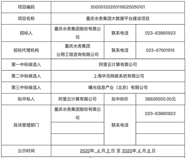 4月2日,重慶水務(wù)集團(tuán)大數(shù)據(jù)平臺(tái)建設(shè)項(xiàng)目發(fā)布中標(biāo)候選人公示,阿里云計(jì)算有限公司
