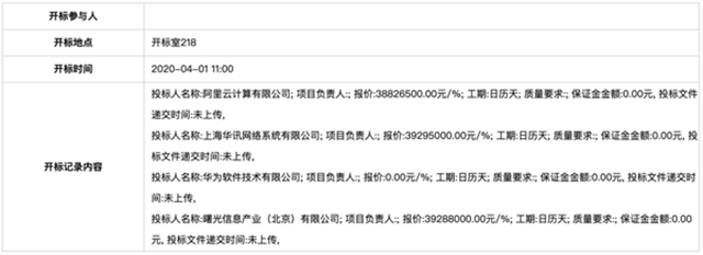 投標(biāo)人:華為軟件技術(shù)有限公司報(bào)價(jià):0.00元(云頭條經(jīng)核實(shí),華為未繳納投標(biāo)保證金,未參與投標(biāo),所以顯示報(bào)價(jià) 0 元)