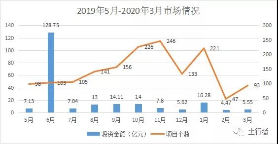 受疫情影響總體上項目數(shù)量和投資金額與2019年下半年每月相比下降幅較大;3月份較2月份項目數(shù)量增加119%,投資金額增長24%,市場情況趨勢好轉。