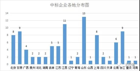 根據(jù)圖例中標企業(yè)數(shù)量較多的地區(qū)為江西、山東兩個省分別為10家以上,占中標企業(yè)數(shù)的24.5%