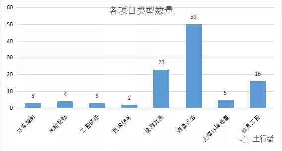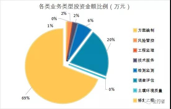 從圖例數(shù)據(jù)分析來看主要項目數(shù)量看以調查評估項目為50個,占總項目的48.5%,檢測監(jiān)測項目為23個占總項目的22.3%,修復工程項目個數(shù)為15個占總項目的15.5%。從投資金額上面分析修復工程項目占總投資額的69%投資金額最多,其次是調查評估項目占比20%。