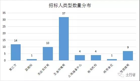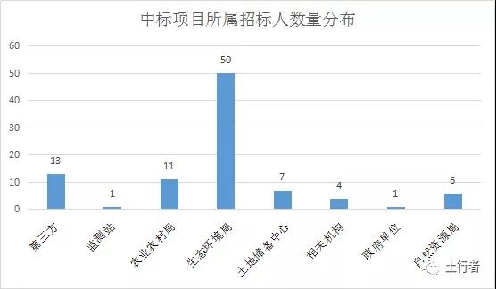 中標項目所屬招標單位概況,共計103個項目所屬80家招標人。其中56個項目歸各地生態(tài)環(huán)境局所屬,占項目方的54.4% 第三方招標人有15個 占項目方的14.6%。生態(tài)環(huán)境局為主要招標人共計37家 占招標人的46.25%。