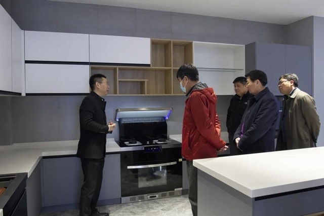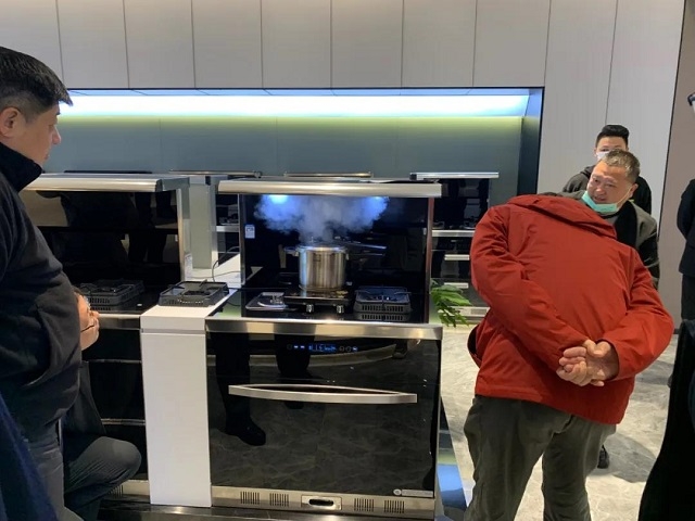 在結(jié)束參觀后,葉局長(zhǎng)一行來到了永發(fā)機(jī)電的兄弟公司——廚壹堂集成灶參觀考察。在高總的陪同下,葉局長(zhǎng)一行參觀了公司剛剛竣工的1000㎡+全新展廳,在近距離觀察和了解了廚壹堂系列集成灶的各項(xiàng)功能后,一眾領(lǐng)導(dǎo)對(duì)展廳的設(shè)計(jì)理念以及廚壹堂集成灶99.9%的油煙吸凈率大加贊賞。