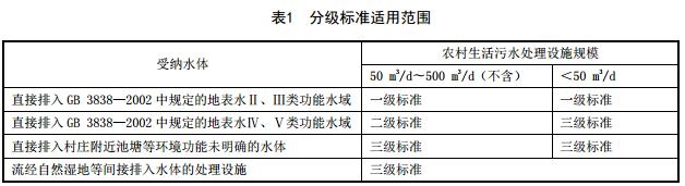 4.1.2 規(guī)模<500 m³/d 的農(nóng)村生活污水處理設(shè)施水污染物排放分為一級標(biāo)準(zhǔn)、二級標(biāo)準(zhǔn)和三級標(biāo)準(zhǔn),分級標(biāo)準(zhǔn)適用范圍見表1。