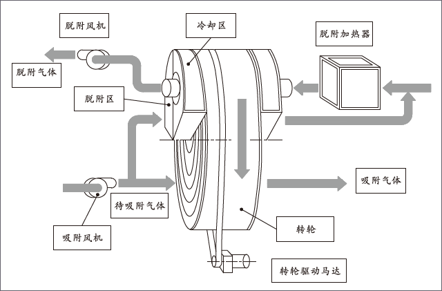 據(jù)介紹,分子篩吸附濃縮轉(zhuǎn)輪分為吸附區(qū)、脫附區(qū)、冷卻區(qū),轉(zhuǎn)輪在各個(gè)區(qū)域連續(xù)運(yùn)轉(zhuǎn)。VOCs廢氣經(jīng)過濾裝置等預(yù)處理之后,進(jìn)入轉(zhuǎn)輪吸附區(qū)被吸附凈化排除;吸附飽和后的分子篩進(jìn)入脫附區(qū),經(jīng)高溫?zé)犸L(fēng)進(jìn)行脫附濃縮;高溫脫附后的區(qū)域由冷空氣進(jìn)行冷卻再生,用于冷卻的空氣經(jīng)加熱后可以作為再生空氣使用。