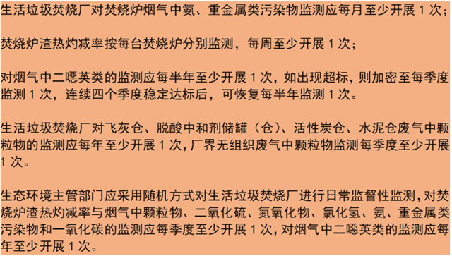 污染物監(jiān)測(cè)要求:生活垃圾焚燒廠運(yùn)行企業(yè)要建立企業(yè)監(jiān)測(cè)制度,制定監(jiān)測(cè)方案,開(kāi)展監(jiān)測(cè)并公布監(jiān)測(cè)結(jié)果。應(yīng)根據(jù)監(jiān)測(cè)污染物的種類(lèi),在規(guī)定的污染物排放監(jiān)控位置進(jìn)行。在線監(jiān)測(cè)結(jié)果應(yīng)采用電子顯示板進(jìn)行公示并與當(dāng)?shù)厣鷳B(tài)環(huán)境主管部門(mén)和行業(yè)行政主管部門(mén)監(jiān)控中心聯(lián)網(wǎng)。煙氣在線監(jiān)測(cè)指標(biāo)應(yīng)至少包括煙氣中顆粒物、二氧化硫、氮氧化物、一氧化碳和氯化氫。