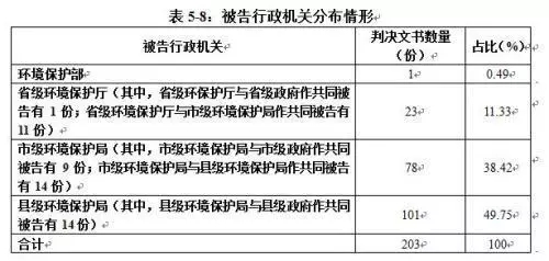 數(shù)據(jù)顯示,2016年全年,縣級環(huán)境保護局作為被告行政機關的裁決文書數(shù)量達101份, 占比最高,達到49.75%。其中,縣級環(huán)境保護局與縣級政府作共同被告有14份。