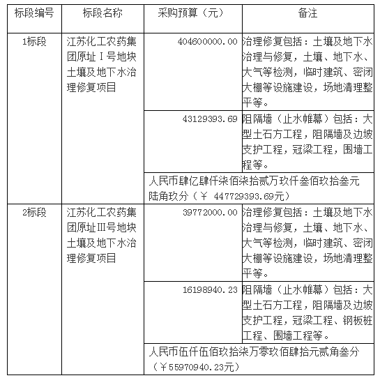 (1)招標(biāo)內(nèi)容:江蘇化工農(nóng)藥集團(tuán)原址Ⅰ號地塊土壤及地下水治理修復(fù)項(xiàng)目
