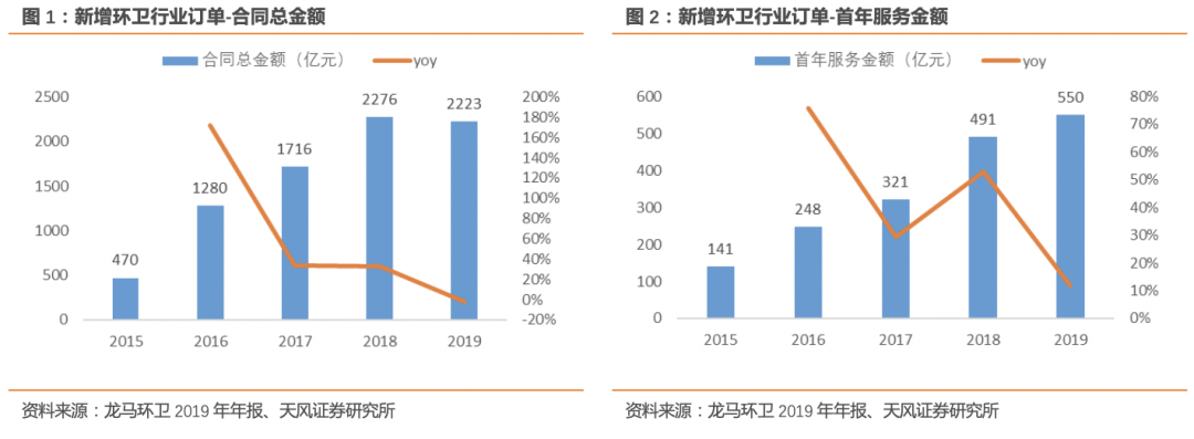 1.2. 環(huán)衛(wèi)市場化新增訂單連續(xù)兩年突破2000億元經(jīng)過2015年至今的快速推廣,全國環(huán)衛(wèi)行業(yè)新增年化訂單已經(jīng)達到550億,同比增長12%;總合同額達到2223億元,同比略降2%;平均合同期限4年,同比下降0.6年。2018-2019年連續(xù)兩年環(huán)衛(wèi)市場化新增合同總金額突破2000億元,市場化快速推廣。1.3. 本輪環(huán)衛(wèi)市場化快速推進的背后,是垃圾分類強制推動2018-2019年環(huán)衛(wèi)市場化快速推進背后的主要原因,是垃圾分類強制實施的政策催化。2016年底,習(xí)近平總書記在中央財經(jīng)領(lǐng)導(dǎo)小組第十四次會議上強調(diào)普遍推行垃圾分類制度,2017年以來垃圾分類相關(guān)細(xì)化政策不斷出臺。2019年上海市開始強制垃圾分類,深圳、北京等城市陸續(xù)跟進,垃圾分類從政策規(guī)劃真正走向落地實施。垃圾分類市場強制推進,為環(huán)衛(wèi)市場帶來新的變化。單獨的垃圾分類招標(biāo)項目增加,垃圾分類成為環(huán)衛(wèi)一體化標(biāo)配作業(yè)內(nèi)容,和環(huán)衛(wèi)服務(wù)打包招標(biāo)。1.4. 2016年以來市容環(huán)境衛(wèi)生類支出持續(xù)增加短期來看,環(huán)衛(wèi)行業(yè)的資金來源仍為財政資金城市環(huán)境衛(wèi)生支出。根據(jù)住建部統(tǒng)計年鑒,2018年我國城市、縣城、鎮(zhèn)、鄉(xiāng)、村等合計環(huán)境衛(wèi)生投資額1267億元,同比增長12.33%。2016以來市容環(huán)境衛(wèi)生類投資支出持續(xù)增加。2. 環(huán)衛(wèi)服務(wù)行業(yè)的市場空間有多大?從傳統(tǒng)環(huán)衛(wèi)向城市物業(yè)管理擴容傳統(tǒng)環(huán)衛(wèi)行業(yè)指道路清掃、垃圾清運、公廁管理等,而事實上,隨著政府簡政放權(quán),對作業(yè)效率和作業(yè)效果的標(biāo)準(zhǔn)日益提高,單位作業(yè)單價有提升空間,新的公共服務(wù)領(lǐng)域開始市場化,環(huán)衛(wèi)行業(yè)整體市場空間仍有很大擴容空間。垃圾分類、綠化養(yǎng)護、照明維護等更多內(nèi)容被納入環(huán)衛(wèi)一體化招標(biāo)訂單中,環(huán)衛(wèi)行業(yè)的內(nèi)涵日益豐富,向城市綜合管理服務(wù)邁進。2.1. 傳統(tǒng)環(huán)衛(wèi)服務(wù)市場空間近1500億元,2025年可達2300億按照最新統(tǒng)計數(shù)據(jù)進行的市場空間測算顯示,城市與縣城道路清掃、垃圾清運、公廁維護等市場空間分別為1048億、211億、224億,傳統(tǒng)意義上的環(huán)衛(wèi)服務(wù)市場空間約1483億元??紤]城鎮(zhèn)化帶來的道路面積增加、和物價上漲帶來的單價提高,預(yù)計2025年傳統(tǒng)環(huán)衛(wèi)市場空間會提高至2296億。2.2. 垃圾分類市場潛在空間800億以上,2025年可釋放近600億垃圾分類是潛在市場空間接近千億的新興市場,涉及垃圾分類設(shè)施、垃圾分選設(shè)備、垃圾分類服務(wù)、推廣宣傳、軟硬件IT服務(wù)、分類實施效果測評服務(wù)、咨詢服務(wù)等。2017年垃圾分類試點項目開始釋放,但規(guī)模普遍偏??;2018年以來,大體量垃圾分類項目開始出現(xiàn)。按照城市居民每戶20元/月,縣城居民每戶10元/月的標(biāo)準(zhǔn)進行測算,垃圾分類整體市場空間在800億以上。根據(jù)住建部的要求,全國46個城市在2020年前完成垃圾分類;到2025年,全國地級及以上城市基本建成生活垃圾分類處理系統(tǒng)。46個城市對應(yīng)居民戶數(shù)約1億戶,按照20元/戶/月測算,2020年前將釋放的市場空間約242億;全國地級以上城市約2.43億戶,到2025年垃圾分類的市場空間將達到583億。傳統(tǒng)的部門分散管理模式容易產(chǎn)生職能交叉、管理空白,管理責(zé)任機制弱化等問題,未來城市管理從分散走向綜合是發(fā)展大趨勢,可增強城市管理工作的綜合性、整體性和協(xié)調(diào)性。各地已在陸續(xù)推動部門分散管理向綜合管理轉(zhuǎn)變:- 北京已成立城市管理委員會,整合市政市容委全部職責(zé)的基礎(chǔ)上,將多個市級部門與城市運行管理相關(guān)的職責(zé)一并劃歸,比如發(fā)改委的煤、電、油、氣管理,市商務(wù)委的再生資源回收管理,市園林綠化局的城市綠化帶環(huán)境衛(wèi)生管理,市水務(wù)局的城市河湖周邊環(huán)境衛(wèi)生管理等。同時,財政預(yù)算維穩(wěn)資金和市政設(shè)施建設(shè)的統(tǒng)籌管理職責(zé),也將劃歸給城市管理委員會。