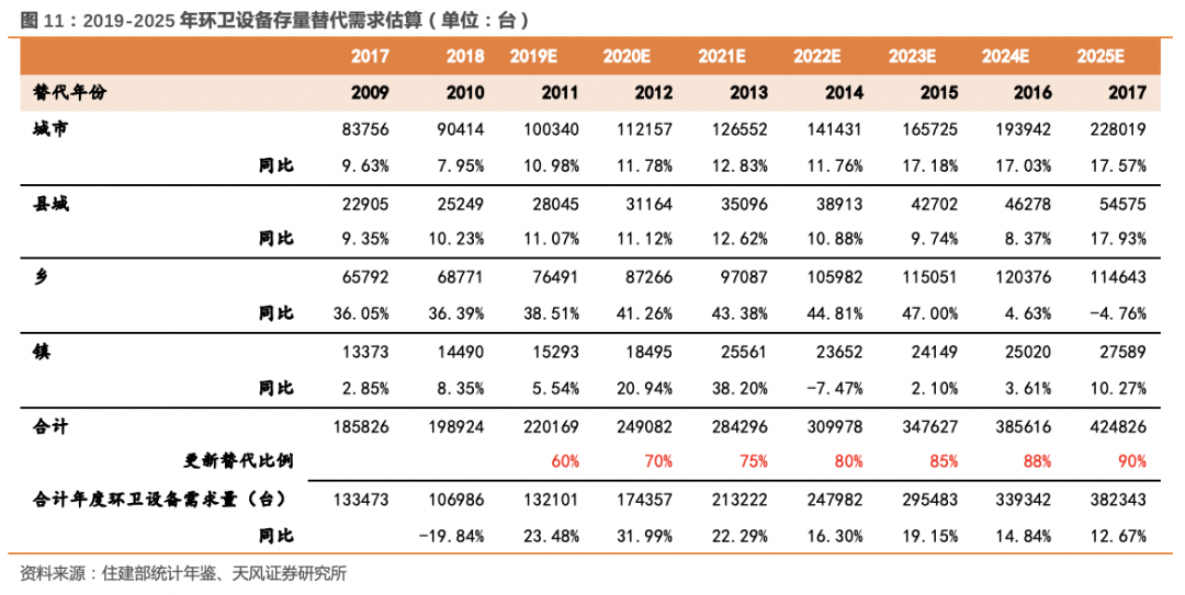 根據(jù)住建部的統(tǒng)計年鑒,2018年我國城市道路機械化率68.85%、縣城道路機械化率63.70%,城市和縣城合計的道路清掃保潔機械化率約67.68%,達到基本環(huán)衛(wèi)裝備階段。因經(jīng)濟發(fā)展水平與地域差異,不同區(qū)域間的機械化清掃水平存在差異,除省會城市和經(jīng)濟較發(fā)達地級市外,其他城市和縣城距離實現(xiàn)全面環(huán)衛(wèi)裝備階段還有差距。3.2. 機械化率存在提升空間,年度新增設(shè)備需求2-3萬臺/年根據(jù)住建部相關(guān)文件的要求,到 2020 年底前,地級及以上城市建成區(qū)道路機械化清掃率達到70%以上,縣城達到 60%以上,京津冀及周邊地區(qū)、長三角地區(qū)、汾渭平原等重點區(qū)域要顯著提高。根據(jù) 2018 年《中國城鄉(xiāng)建設(shè)統(tǒng)計年鑒》計算,2018 年我國城市道路清掃面積 86.93億平方米,機械化清掃面積 59.86億平方米,機械化清掃率為 68.85%;縣城道路清掃保潔面積 25.56億平方米,機械化清掃面積16.80億平方米,機械化清掃率僅為 63.70%。我們基于機械化率提升和單位面積環(huán)衛(wèi)車輛的假設(shè),對新增環(huán)衛(wèi)車輛市場需求進行估算,假設(shè)2019-2025年:- 城市道路清掃保潔面積年均復(fù)合增速3%左右,城市機械化率可逐步提升至80%,單位面積環(huán)衛(wèi)車輛維持0.42萬臺/億平米;