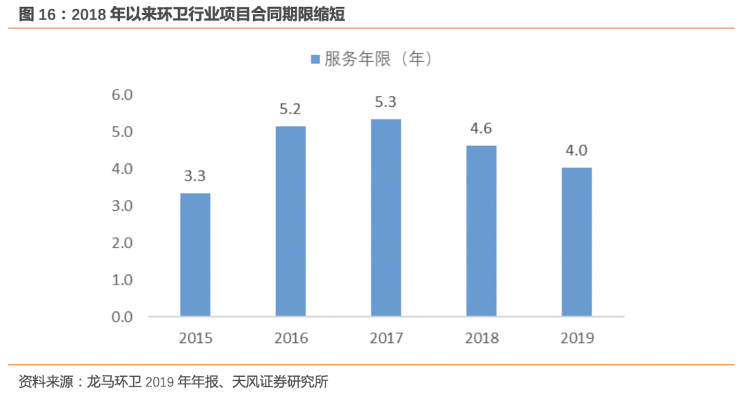 4.2. 行業(yè)參與者增多,跑馬圈地正當(dāng)時環(huán)衛(wèi)行業(yè)巨大的市場空間和良好的商業(yè)模式,吸引各方社會資本加入,2018年行業(yè)參與者約4000余家,前五大企業(yè)市場份額約11.4%。目前行業(yè)內(nèi)參與者可大致分為以下幾類:環(huán)衛(wèi)專業(yè)服務(wù)商如玉禾田、僑銀環(huán)保、新安潔、升禾環(huán)保等;國企改制單位,如北京環(huán)衛(wèi)集團、名城科技等;固廢終端處置商,如啟迪桑德、中國天楹、錦江環(huán)境等;環(huán)衛(wèi)設(shè)備制造商,如龍馬環(huán)衛(wèi)、中聯(lián)環(huán)境;環(huán)衛(wèi)信息化解決商,如伏泰科技;以及其他新進入者,如北控城市資源、聯(lián)運環(huán)境等。4.3. PPP模式預(yù)期升溫,資金門檻提升環(huán)衛(wèi)服務(wù)按照政府招標(biāo)模式一般分為政府購買服務(wù)或PPP兩類,政府購買服務(wù)一般運營期限較短,約3-5年;PPP模式的環(huán)衛(wèi)項目一般體量較大,運營期限約15-30年。2018年P(guān)PP模式降溫,平均合同期有所縮短:行業(yè)發(fā)展初期訂單以政府購買服務(wù)方式為主;2016-2017年P(guān)PP模式訂單快速增長,訂單平均運營期限拉長;2018年以來,受PPP政策監(jiān)管影響,PPP模式訂單增速放緩,訂單平均運營期限有所縮短。自2019年下半年以來,PPP模式類項目預(yù)期有所升溫,主要由于垃圾分類帶動下的中轉(zhuǎn)設(shè)備、中轉(zhuǎn)設(shè)施、末端處置設(shè)施建設(shè)資金需求,帶動環(huán)衛(wèi)訂單從單一的環(huán)衛(wèi)清掃保潔,向環(huán)衛(wèi)一體化方向發(fā)展,PPP模式類項目往往伴隨著前期資金的投入,將提高行業(yè)資金門檻。4.4. 二次市場化帶來新機遇,提升環(huán)衛(wèi)行業(yè)集中度雖然環(huán)衛(wèi)行業(yè)市場化訂單整體增速有所放緩,但我們注意到隨著首次市場化的環(huán)衛(wèi)項目合同到期,大量環(huán)衛(wèi)項目迎來二次市場化。在城市管理由分散走向綜合,以及大力發(fā)展垃圾分類的背景下,二次市場化的環(huán)衛(wèi)項目普遍具有規(guī)模化、一體化、智能化的趨勢,行業(yè)進入門檻提高,行業(yè)集中度將不斷提升。以深圳市環(huán)衛(wèi)項目為例,深圳市現(xiàn)有的環(huán)衛(wèi)管理業(yè)務(wù)包括“市政道路清掃保潔、生活垃圾收集、運輸及處理,公廁管理等”,實行市、區(qū)、接到三級管理體制。1984年,深圳市在全國率先推動道路清掃保潔市場化;1993年,深圳市環(huán)衛(wèi)處將清掃保潔業(yè)務(wù)管理權(quán)限移交給區(qū)一級;1999年,深圳市環(huán)衛(wèi)處將垃圾運輸作業(yè)管理權(quán)限下放到區(qū)一級;2019年深圳市引入環(huán)衛(wèi)PPP模式:- 2019年9月27日,深圳市第一個環(huán)衛(wèi)PPP項目——深圳市福田區(qū)政府環(huán)衛(wèi)PPP項目公開招標(biāo),盈峰環(huán)境全資子公司中聯(lián)環(huán)境中標(biāo),總金額11.53億元,服務(wù)周期10年。