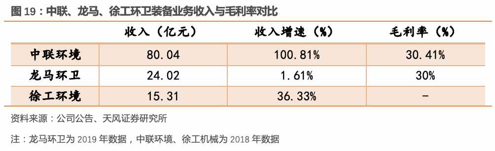 5. 環(huán)衛(wèi)裝備業(yè)的發(fā)展趨勢和競爭格局如何?客戶和產(chǎn)品結(jié)構(gòu)升級,競爭格局穩(wěn)定5.1. 客戶結(jié)構(gòu)變化:環(huán)衛(wèi)市場化推進,市場化客戶占比提升隨著環(huán)衛(wèi)市場化改革的推進,環(huán)衛(wèi)設(shè)備采購客戶類型發(fā)生顯著變化,從政府部門向市場化經(jīng)營主體轉(zhuǎn)變,需求從中高端產(chǎn)品走向高性價比的經(jīng)濟型產(chǎn)品。以龍馬環(huán)衛(wèi)為例,公司2016-2018年政府類客戶收入占比分別為62.03%、56.16%、54.09%,占比逐年下降,相應(yīng)毛利率有所下降。5.2. 產(chǎn)品結(jié)構(gòu)變化:新能源、智能化產(chǎn)品需求提升國務(wù)院發(fā)布的《打贏藍天保衛(wèi)戰(zhàn)三年行動計劃》提出,加快推進城市建成區(qū)新增和更新的環(huán)衛(wèi)等六類車輛使用新能源或清潔能源汽車,重點區(qū)域使用比例達到80%。目前各地方政府已陸續(xù)發(fā)布相關(guān)政策,新能源環(huán)衛(wèi)車輛采購量增長明顯,2019年新能源產(chǎn)品需求量同比增長148.75%。2019年新能源產(chǎn)品在環(huán)衛(wèi)產(chǎn)品市場比重約3.42%,同比上升約2個百分點,未來幾年環(huán)衛(wèi)裝備新能源化進程將進一步加快。此外,智能化產(chǎn)品逐步開始由概念到落地運營,2019年盈峰環(huán)境組建的“5G+環(huán)衛(wèi)機器人編隊”正式投入深圳市福田區(qū)福田街道清掃保潔工作,成為國內(nèi)首個落地運營的5G智能清掃環(huán)衛(wèi)PPP項目,智能設(shè)備安裝5G數(shù)據(jù)終端,基于物聯(lián)網(wǎng)進行調(diào)動和管理,并通過人工智能技術(shù)進一步提升市政環(huán)衛(wèi)作業(yè)的效率和效果。環(huán)衛(wèi)裝備行業(yè)的競爭格局相對穩(wěn)定,全國環(huán)衛(wèi)車輛生產(chǎn)企業(yè)約322家,市場參與者較多,但普遍規(guī)模較小。根據(jù)行業(yè)強制險的統(tǒng)計數(shù)據(jù),截止2019年底,年銷量超過7000臺/套只有三家,TOP3市場份額從2016年的37%上升至2019年的40%。目前我國環(huán)衛(wèi)裝備市場的主要參與者包括中聯(lián)重科、龍馬環(huán)衛(wèi)、以湖北程力為代表的湖北改裝企業(yè),以北汽福田為主的底盤廠家。另外,由于國外進口的環(huán)衛(wèi)清潔及垃圾收轉(zhuǎn)裝備的價格偏高,因此進口產(chǎn)品數(shù)量很少,國外廠商與國內(nèi)廠商的市場定位不同,難以形成直接競爭。環(huán)衛(wèi)裝備行業(yè)屬于改裝行業(yè),具有較高的技術(shù)、品牌、營銷網(wǎng)絡(luò)、售后服務(wù)、資質(zhì)及資金壁壘,對客戶需求、采購習(xí)慣具有較高的要求,行業(yè)領(lǐng)先者主要通過提高產(chǎn)品性能和技術(shù)水平、豐富產(chǎn)品種類、完善客戶服務(wù)體系等手段進行競爭。環(huán)衛(wèi)行業(yè)目前處于市場化快速發(fā)展階段,2018-2019年新增訂單已連續(xù)兩年突破2000億元,垃圾強制分類是推動本輪市場化改革的重要原因。隨著城市管理由分散走向集中,我們認(rèn)為傳統(tǒng)環(huán)衛(wèi)服務(wù)市場將不斷擴容,向城市綜合物業(yè)方向發(fā)展。目前行業(yè)集中度仍然較低,但環(huán)衛(wèi)服務(wù)二次市場化帶來的新機遇值得重視,一體化環(huán)衛(wèi)PPP項目增多,將提高行業(yè)門檻,預(yù)計行業(yè)集中度將明顯提升。我們認(rèn)為環(huán)衛(wèi)服務(wù)龍頭企業(yè)將同時受益于行業(yè)空間擴容、和市場集中度提升,建議關(guān)注【玉禾田】【僑銀環(huán)?!俊君堮R環(huán)衛(wèi)】【啟迪桑德】【北控城市資源】【盈峰環(huán)境】【中國天楹】。環(huán)衛(wèi)裝備方面,我國城鎮(zhèn)與縣城合計機械化率67.68%,達到基本環(huán)衛(wèi)裝備階段,不同區(qū)域間機械化率差別較大,預(yù)計未來存量更新需求將逐步崛起,產(chǎn)品向新能源、智能化方向發(fā)展,客戶結(jié)構(gòu)中市場化客戶占比提升,行業(yè)格局將維持穩(wěn)定,建議關(guān)注【盈峰環(huán)境】【龍馬環(huán)衛(wèi)】。行業(yè)競爭加劇、環(huán)衛(wèi)市場化推進慢于預(yù)期、存量裝備更新替代慢于預(yù)期