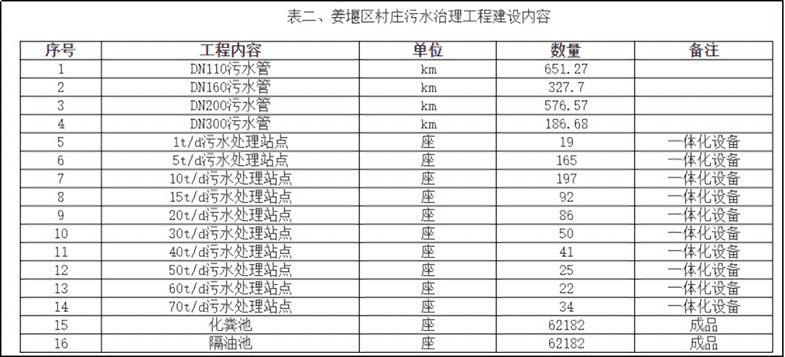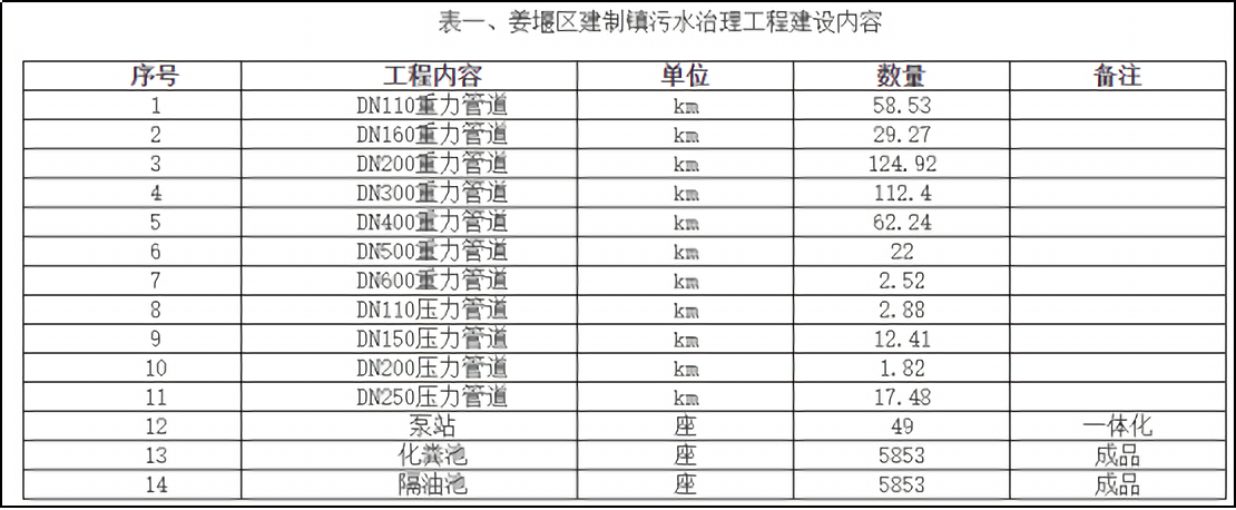 對于建制鎮(zhèn)子項目,該項目包括管網(wǎng)工程、泵站、化糞池、隔油池等的建設,具體如下表所示: