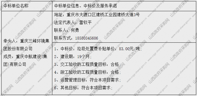 另據(jù)了解,項目投資規(guī)模69665萬元,合作期限30年。重慶三峰環(huán)境集團(tuán)股份有限公司為聯(lián)合體牽頭人。具體中標(biāo)信息如下:
