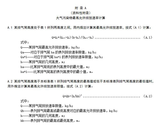 4.5.2 排氣筒高度處于表1所列的兩個排氣筒高度之間時,其執(zhí)行的最高允許排放速率以內插法計算,內插法計算式見附錄A。排氣筒高度低于15 m,大氣污染物最高允許排放濃度按排氣筒大氣污染物排放限值的50%執(zhí)行,排放速率限值按外推法計算的50%執(zhí)行,外推法計算式見附錄A。