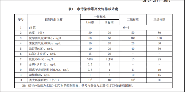 2015年版:污染物控制項目共11項,分別為陰離子表面活性劑、色度、五日生化需氧量(BOD5)、pH值、化學需氧量(COD)、懸浮物(SS)、氨氮(NH3-N)、總氮(以N計)、總磷(以P計)、動植物油、糞大腸菌群。