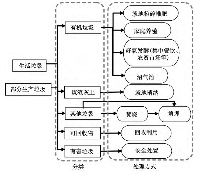 3)采用區(qū)域統(tǒng)籌方式解決其他垃圾的終端處置。農(nóng)村生活垃圾產(chǎn)生源分散,因此考慮到運(yùn)輸成本和經(jīng)濟(jì)性,不宜建設(shè)小型處理設(shè)施;而其他垃圾不存在易腐等問題,適宜與城市生活其他垃圾進(jìn)行集中處置、統(tǒng)籌管理。