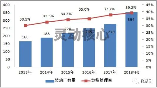 據(jù)靈動(dòng)核心產(chǎn)業(yè)研究中心發(fā)布的《2019-2024年中國垃圾焚燒發(fā)電行業(yè)現(xiàn)狀深度分析及前景投資分析報(bào)告》數(shù)據(jù)顯示,2018年新投入運(yùn)行的生活垃圾焚燒廠超過70座,在建項(xiàng)目166座,擬建項(xiàng)目201座。2017年,我國城市生活垃圾焚燒處理量已達(dá)到7589萬噸,同比增長2.9%;此外,焚燒垃圾場數(shù)量從2010年的104座增加至2018年的354座,焚燒處理率由2010年的18.8%提高至39.2%。