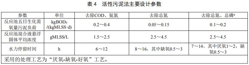 8.2.3.8 活性污泥法宜通過投加填料等方式,提高污泥濃度和耐沖擊負(fù)荷能力,改善處理效果。主要設(shè)計參數(shù)宜參考表 4 取值。采用活性污泥法時,進水 BOD5含量不宜小于 60mg/L。