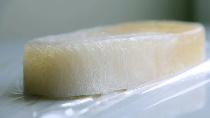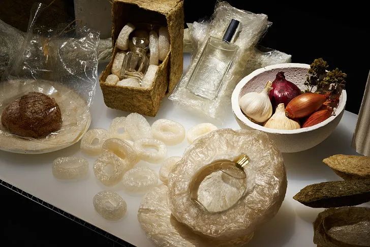 那要用什么替代塑料呢?他們發(fā)現(xiàn)了制作和菓子的主料,瓊脂,就是一個(gè)很適合的替代品。瓊脂的質(zhì)地透明多變,薄厚軟硬可以輕松調(diào)節(jié),還能夠自然降解,是一個(gè)可塑性強(qiáng)、潛力無(wú)限的材質(zhì)。瓊脂做的包裹填充物,比泡泡紙更輕盈也更有彈性,它成功保護(hù)著Araki的快遞從日本安全抵達(dá)意大利,此等優(yōu)越發(fā)明讓Araki獲得了2016年Lexus全球設(shè)計(jì)大獎(jiǎng)。此外,Araki還試著用天然的松樹(shù)脂和植物蠟,代替常見(jiàn)的亞克力材料。他設(shè)計(jì)的植脂花瓶,柔韌且防水,又比塑料更多了一份氤氳。植物材料天生有記憶屬性,在不同的溫度控制下,很容易用手工塑形,讓這些花器有了流水線產(chǎn)品缺少的溫度。而作為大米消費(fèi)大國(guó),日本每年都有成噸的大米囤積發(fā)霉變質(zhì)。Araki借鑒日本歷史上,用大米制成膠水穩(wěn)固房屋的案例,他用大米膠水粘合木屑和黃麻,制成強(qiáng)韌的圓柱體。