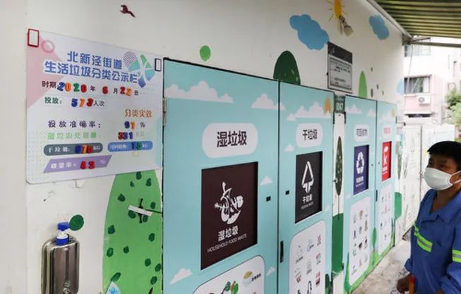 在上海長(zhǎng)寧區(qū)新涇六村小區(qū)垃圾分類(lèi)投放點(diǎn),公示欄上顯示前一天的垃圾分類(lèi)情況數(shù)據(jù)(6月23日攝)。新華社記者 方喆 攝