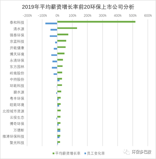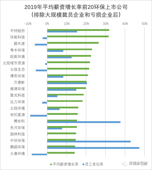 多就是多,少就是少,在此沒(méi)有必要對(duì)個(gè)別企業(yè)作單獨(dú)展開(kāi)。咱說(shuō)說(shuō)整體情況,2019年,百余家環(huán)保上市公司為超過(guò)40萬(wàn)員工支付的薪酬為464.8億元,平均年薪為11.41萬(wàn)元,較2018年增長(zhǎng)了1.84萬(wàn)元。聽(tīng)起來(lái)還不錯(cuò),但注意這是企業(yè)端的薪金成本,并非員工到手的收入,不精細(xì)地推算,對(duì)應(yīng)員工平均月薪為稅前8300元。智聯(lián)招聘針對(duì)2019年冬季求職行業(yè)平均薪酬的調(diào)查數(shù)據(jù)顯示環(huán)保行業(yè)平均薪酬為8070元。將本文研究對(duì)象為水準(zhǔn)偏高的環(huán)保上市公司這一因素考慮在內(nèi),兩個(gè)結(jié)果實(shí)際是高度吻合的。做環(huán)保的企業(yè),哪家還沒(méi)個(gè)Big Dream?當(dāng)下的收入重要,未來(lái)的錢景,也即收入的增長(zhǎng)勢(shì)頭也同樣重要。為此,我將2019年平均薪資增長(zhǎng)率前20位的環(huán)保上市公司摘出,得到如下結(jié)果: