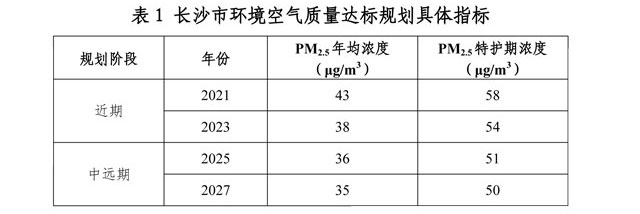 規(guī)劃目標:長沙市PM2.5年均濃度在2027年達標。近期規(guī)劃到2023年,PM2.5平均濃度有效降低,力爭臭氧年均濃度升高趨勢基本得到遏制,中遠期規(guī)劃到2027年,實現(xiàn)PM2.5年均濃度達標,臭氧超標風險顯著降低。具體分階段指標如下: